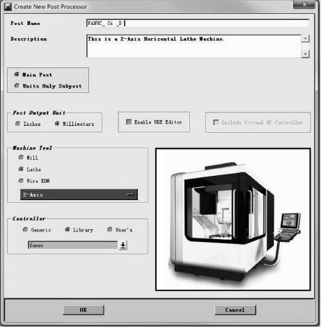 (2)新建一個后處理。在新建后置處理“Creat New Post Processor”對話 框 中 ,Post Name 為 FANUC_ 0i _D,輸出單位“Post Output Unit”設置為米制,機床類型選擇 Lathe(車床),機床控制系統從Library中選擇FANUC,如圖2所示,控制系統的選擇非常重要,一定要正確選擇所用數控系統。
